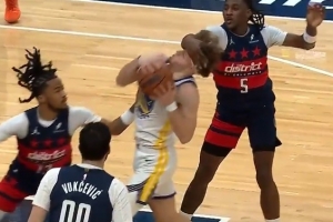 GIF-波尔津吉斯被沃特金斯一巴掌拍到脸部,吃T了