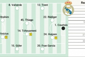 附阿斯预测皇马首发:1-库尔图瓦;20-弗兰·加西亚、24-赫伊森、22-吕迪格、12-阿诺德;15-居莱尔、14-琼阿梅尼、45-蒂亚戈·皮塔奇、8-巴尔韦德;7-维尼修斯、21-卜拉欣·迪亚斯