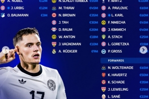 德转更新德国队身价:维尔茨1.1亿欧居首,卡尔6000万欧队内第三