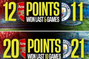 有媒体列出了两队近5轮、10轮以及20轮的积分对比,结果阿森纳近5轮积分比曼城多1分,近10轮、20轮积分则比曼城少1分。